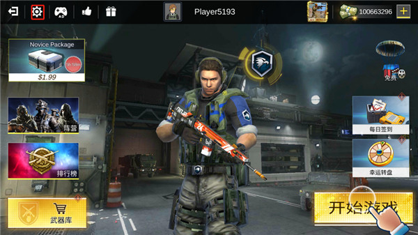 1、打开游戏,进入首页我们可以看到有阵营、排行榜、武器库等等功能板块,我们可以先点击齿轮状的设置键